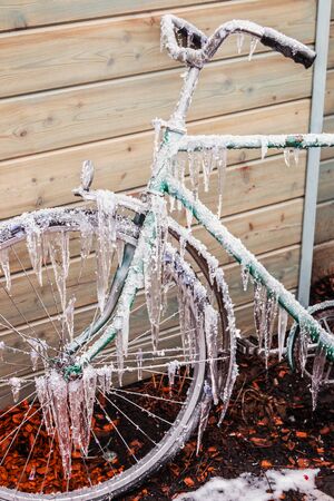 old Bicycle in the yard of the house in icicles and snow from the first frost