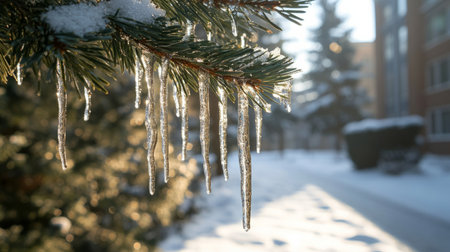Snow-covered pine branch with icicles hanging, cold winter background, generative ai