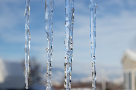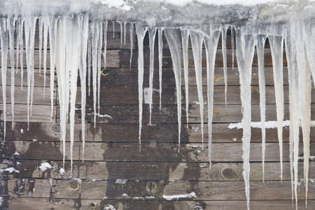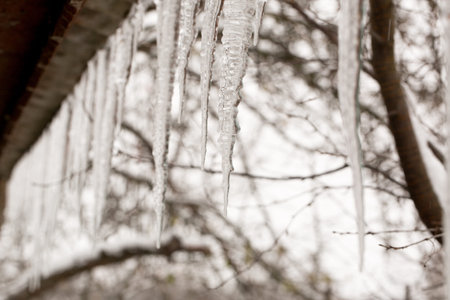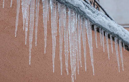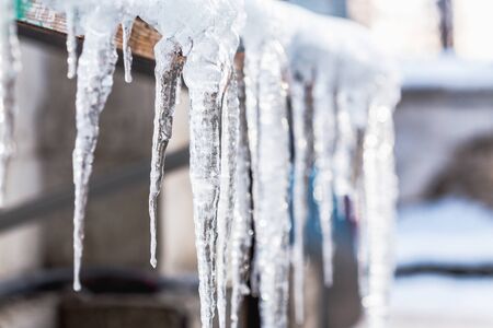 Icicles hanging on the roof. Winter nature abstract art. Physical phenomenon, solid form of water.