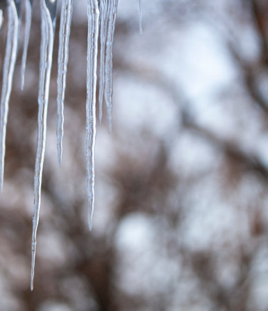 Icicles in Winter, with blurred Background, cold temperatures and frozen water