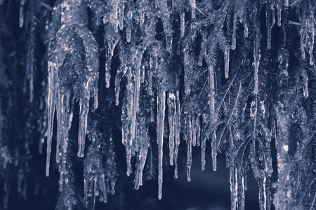 Spruce branches in winter covered with ice and long icicles, closeup, copy space