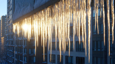 Sunlit icicles hanging from a building, a breathtaking winter scene.