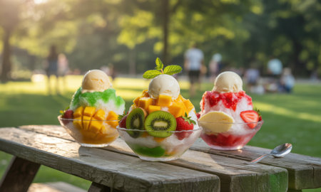 Colorful shaved ice desserts topped with mango, kiwi, strawberry, and vanilla ice cream, served in clear bowls on a wooden picnic table in a sunny park.