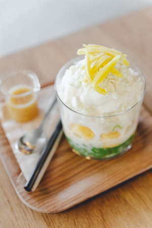 Lod Chong, Thai melon, puffed rice with coconut snow ice topping with sliced jackfruit. Served with caramel on wooden table background.