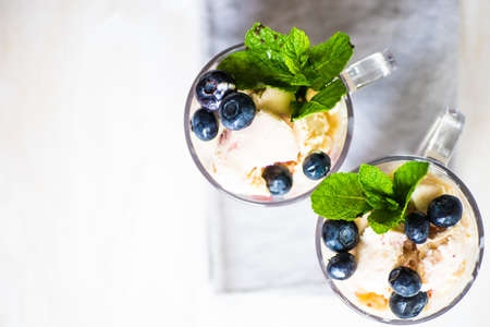 Semmer dessert homemade ice cream with fresh blueberries and strawberries decorated with mint on white background