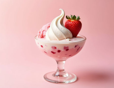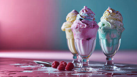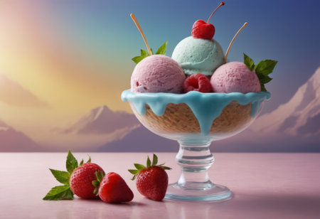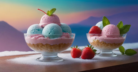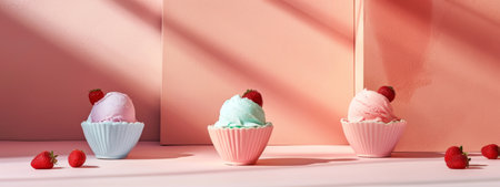 Pastel-colored ice cream scoops placed in decorative cups with strawberries, set against a soft pink background, creating a playful and sweet aesthetic with a focus on the vibrant colors and textures.