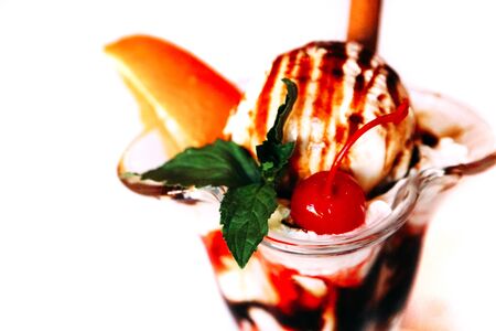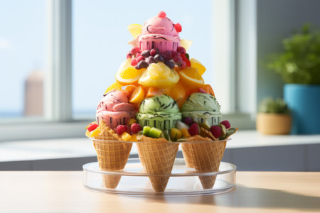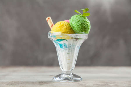 sweet ice cream of various colors and filled with fruit, cream and chocolate sprinkles