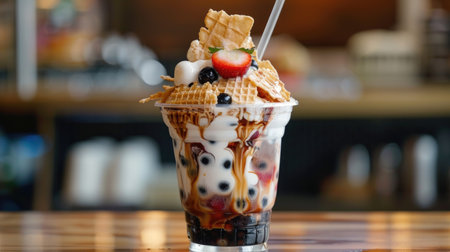 Boba sundae with vanilla soft ice cream, bubble tea, waffle chips topping in a clear cup