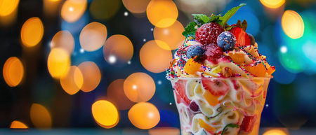 A vibrant and colorful frozen dessert topped with fresh fruits, against a background with bokeh lights.