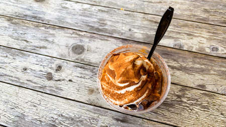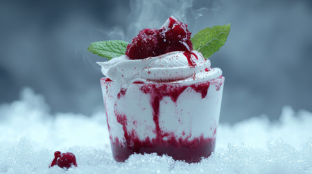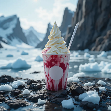 Cup of swirly ice cream on a frosty lake with floating ice with rocky hills in the background