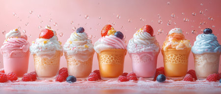 Colorful sundaes feature creamy ice cream, whipped cream, and fresh fruits on a vibrant pink surface.