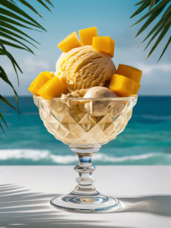 Tropical Mango Ice Cream Sundae on Beachside Resort Table with Ocean View.