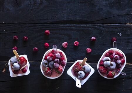 Homemade fresh yogurt. Healthy sweet dessert on dark rustic wooden background. Frozen fruits. Copy space