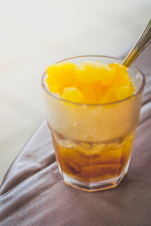 a dessert of Sea coconut with Pineapple and ice served in a glass