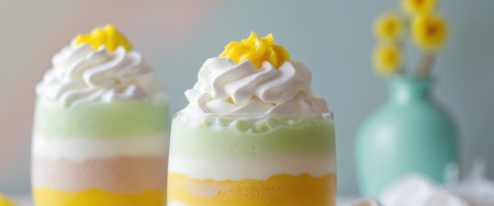 AI Generated. A layered dessert drink with whipped cream and yellow topping