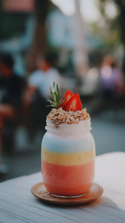 A delicious creamy dessert featuring whipped cream and fresh fruits served in a charming cup, perfect for a delightful summer afternoon at a bustling outdoor cafe.