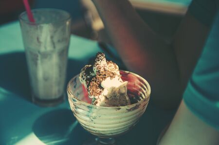 Ice cream. Dessert based on vanilla ice cream and chocolate syrup with cookies.