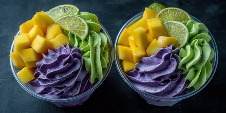 Delight in these vibrant dessert bowls featuring creamy swirls topped with fresh mango and lime. Perfect for summer celebrations or sweet indulgence.