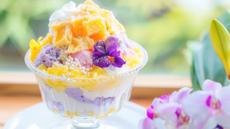 Delight in this colorful dessert featuring vibrant layers of ice cream, fresh mango and purple sorbet, topped with whipped cream and an edible flower.