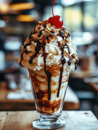 Indulgent ice cream sundae with chocolate sauce, candy, and fruit decoration generated by artificial intelligence