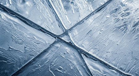 An abstract close-up reveals intersecting ice blocks with internal textures and trapped air bubbles,...