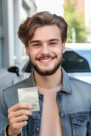 portrait of a happy young man holding his driving license, created with generative ai