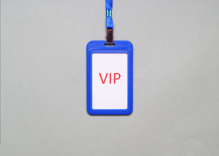 Plastic vip badge on light gray background, top view