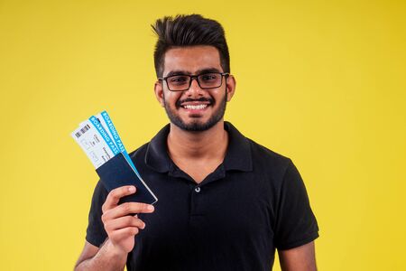 happy indian student male bearded wearing glasses and black t-short holding passport airline ticket yellow studio background . lifestyle summer trip concept
