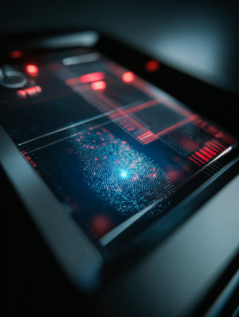 A sleek, high-tech screen features a glowing fingerprint pad, radiating neon hues, embodying tomorrow?s biometric security innovations.