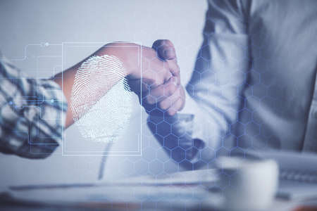 Double exposure of fingerprint hologram and handshake of two men. Security concept.