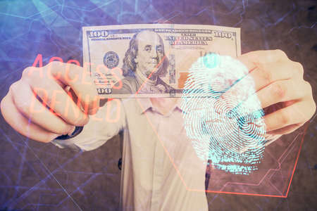 Multi exposure of fingerprint drawing hologram and USA dollars bills and man hands. security concept.
