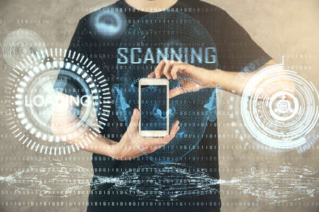 Biometric identification by gadget. Facial recognition technology scan and detect people face for identification. Digital biometric security system that analyze human face to verify personal data.