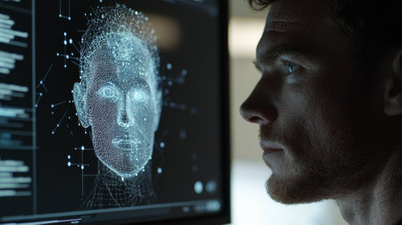 A focused individual observes a detailed digital representation of a human face on a computer screen, symbolizing the blend of technology and art.