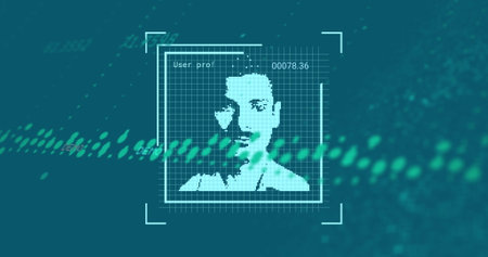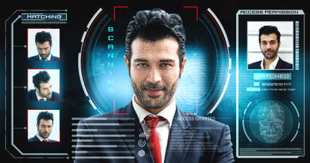 Facial recognition technology scan and detect people face for identification . Future concept interface showing digital biometric security system that analyze human face to verify personal data .