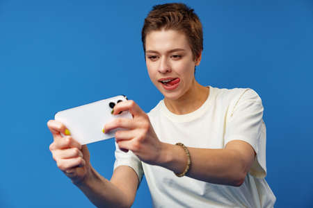Happy attractive young woman enjoy playing video game on smartphone, studio photo