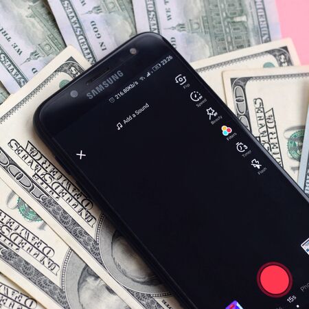 KHARKOV, UKRAINE - FEBRUARY 16, 2020: Smartphone screen with Tiktok app and lot of hundred dollar bills. Business and social networking concept