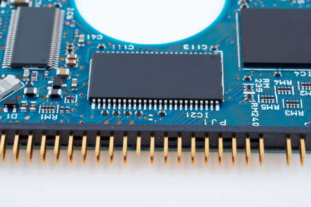 flexible flat cable connector, microchip and other components mounted on printed circuit board, macro. selective focus