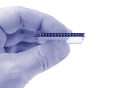 Man hand holds Memory card - Flash card against white background.Concept photo , multimedia, photography,communication, gaming, lifestyle. copy space. (BW)