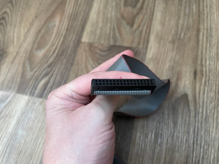 IDE and USB socket on a wooden workshop table. Computer connectors used in electronics. Dark background.