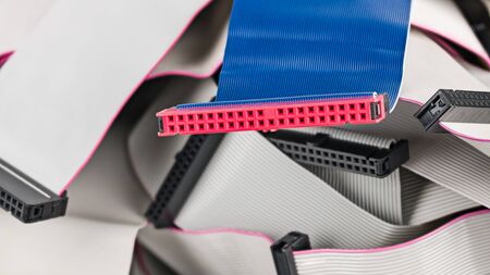 Blue parallel multi wire ribbon cable with pink connector on pile of white flat cords. Detail of internal bus attachment. Integrated drive electronics for connection of different data storage devices.