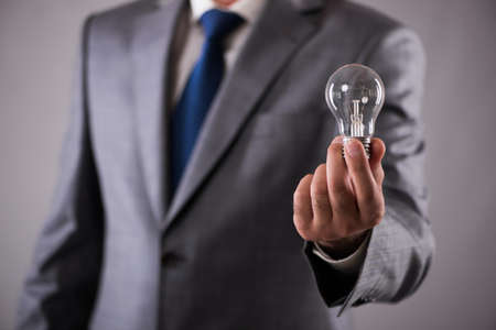 Mid section of businessman holding light bulb against grey background. business idea and professionalism concept