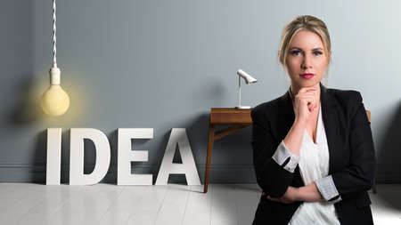 businesswoman in front of a workplace and the word IDEA with a lightbulb on top