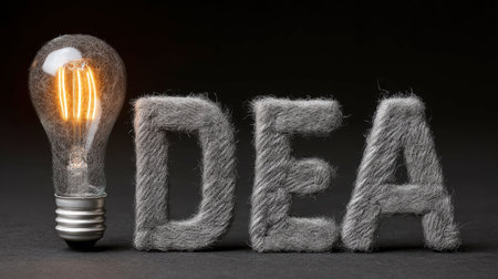 A nostalgic filament bulb radiates warm light, while the word 'idea' pulses in inviting neon hues, evoking sparks of inspiration and inventive thinking.