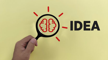 hand holding Magnifying glass with IDEA text, bulb and brain icon on yellow background. idea concept.
