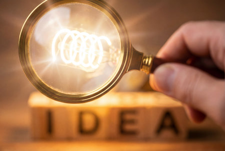 Close view of a hand holding a magnifying glass to reveal a glowing light bulb filament symbolizing inspiration with idea spelled on wooden cubes in the warm background.