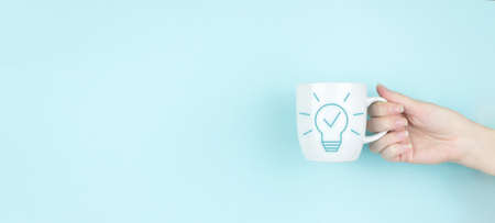 Creative idea.Concept of idea and innovation. Girl hand hold morning coffee cup with sign light bulp Icon on blue background. Solution analysis and development, Innovative technology