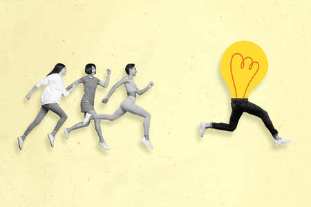 Profile composite image of three woman run after light bulb isolated on drawing yellow background