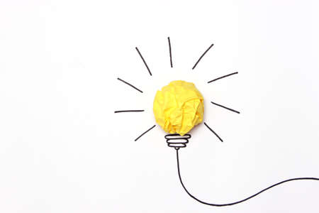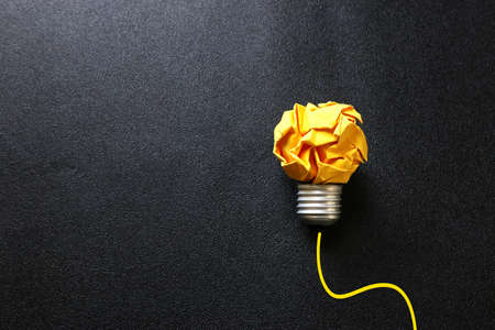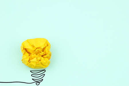 creative concept idea. Painted light bulb with a crumpled paper yellow ball.