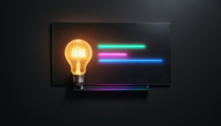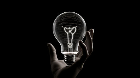Showing glowing IDEA filament in incandescent bulb highlighting screw base, particles on black void. Innovative, creative, illumination, technology, minimalism, futuristic, inspiration