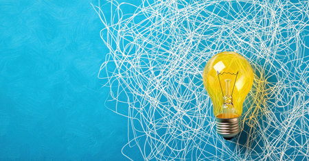 Bright yellow light bulb amidst chaotic white lines on a vibrant blue background, representing creativity and innovative ideas